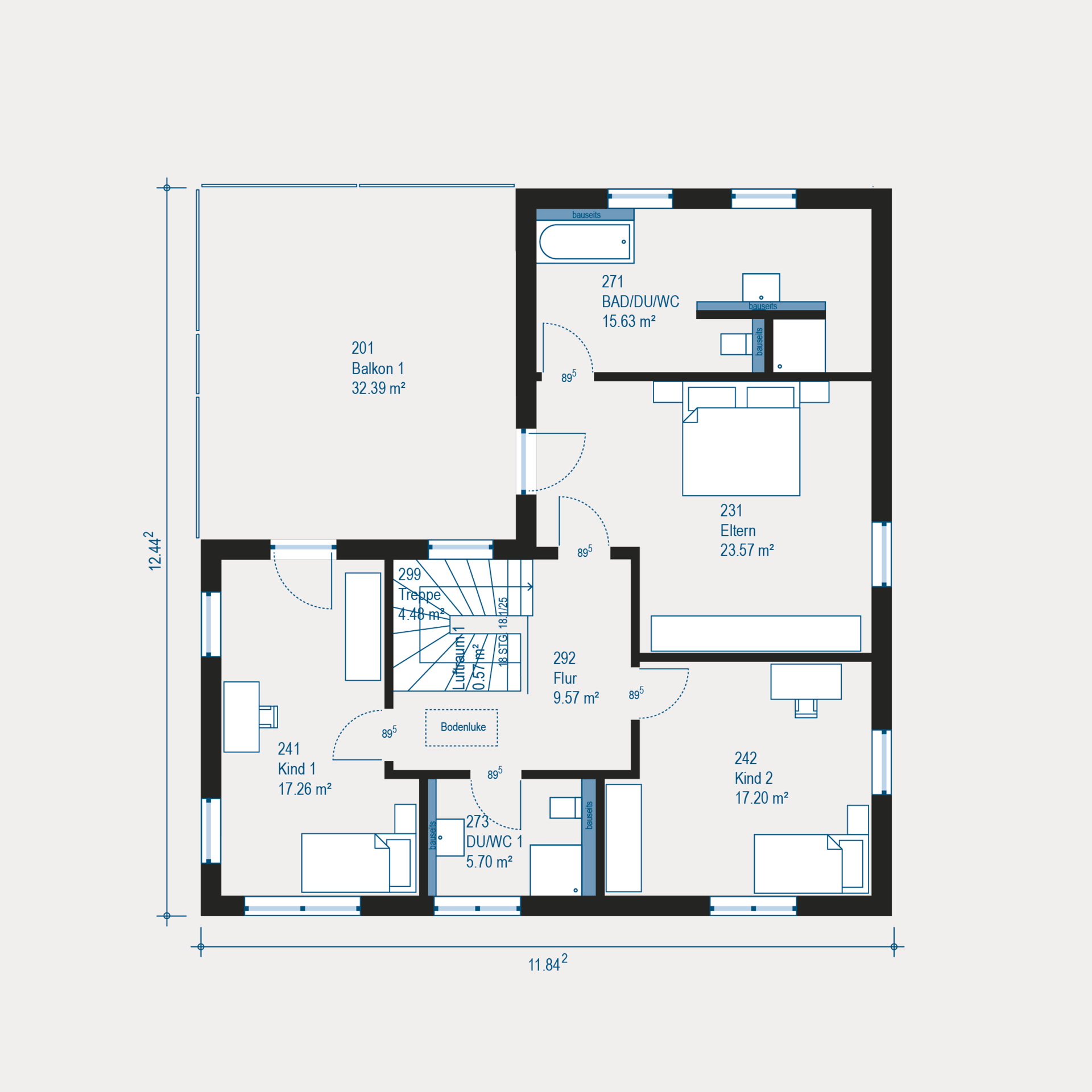 Unsere Stadtvilla City Villa 4 V3 bietet dir alles, was du für ein komfortables und modernes Leben benötigst. Das Elternzimmer bietet nicht nur ausreichend Platz, sondern auch ein separates Ankleidezimmer und ein eigenes Bad für maximale Privatsphäre. Zwei Kinderzimmer mit eingeplanter Dusche und WC garantieren den Kleinen ebenfalls viel Raum und Unabhängigkeit.