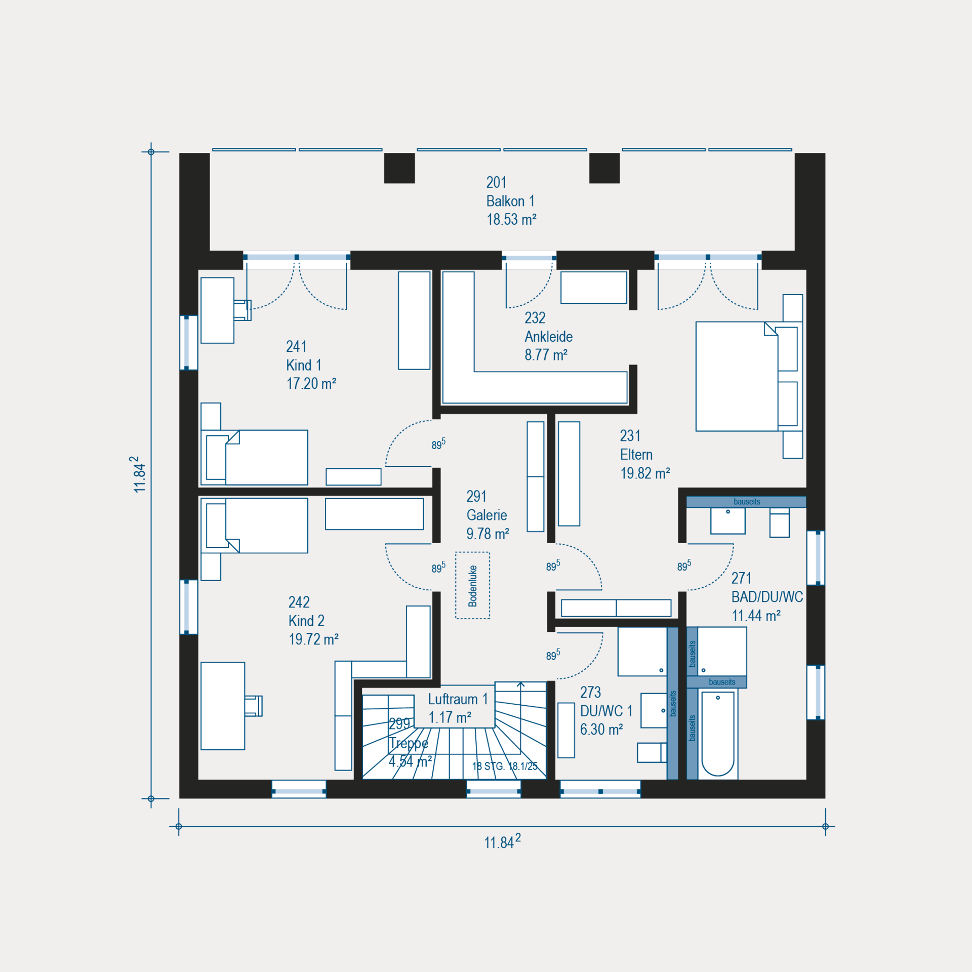 Ein optischer Blickfang ist die Stadtvilla City Villa 5, die durch ihre quadratische Form und eine außergewöhnliche Raumaufteilung besticht: Beispielsweise offene Übergänge von der Küche ins Ess- und Wohnzimmer, eine helle Wellness-Oase sowie eine Speisekammer wurden eingeplant. Im Obergeschoss wird Komfort groß geschrieben: Die drei Schlafzimmer, wovon eines mit Ankleide ausgestattet ist, sowie die beiden separaten Badezimmer bieten viel Platz für Rückzug. Genieße ein ausgiebiges Sonnenfrühstück auf dem großen Balkon, welcher über drei Zugänge zu erreichen ist.