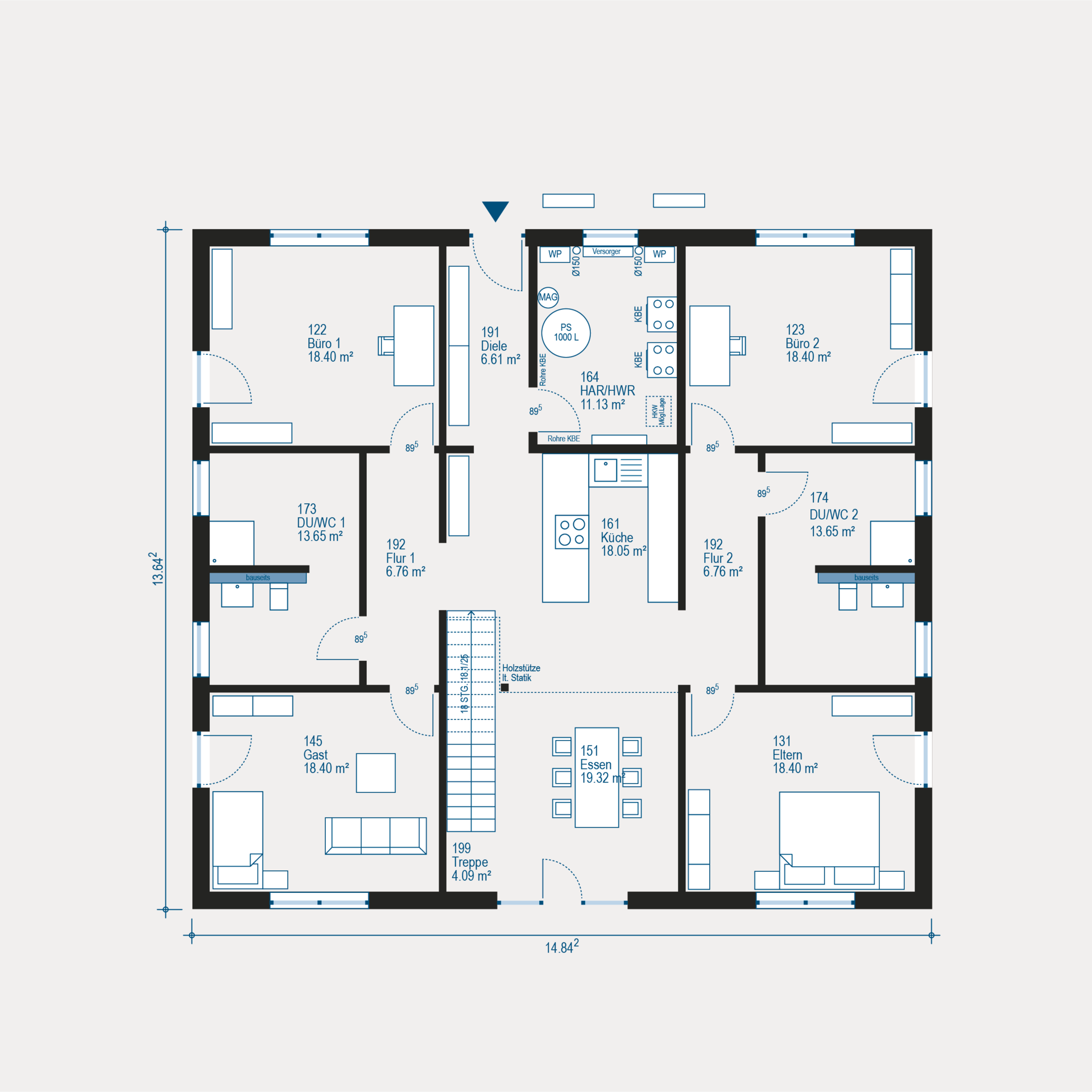 Ob für Großfamilien, für Wohngemeinschaften aller Art oder als Ferienunterkunft, bei der einzelne Schlafräume vermietet werden können – unser Connect 2 bietet dank acht heller Schlafzimmer mit jeweils angeschlossenem Dusch-Bad vielfache Nutzungsmöglichkeiten. Ergänzt wird das flexible Konzept durch einen großzügigen Küchen- und Ess-Bereich im Erdgeschoss sowie einen gemeinsam nutzbaren Wohnraum im Obergeschoss. Hier findet sich zudem ein zusätzliches Zimmer, das etwa als Büro oder Hobbyraum genutzt werden kann. Selbstverständlich zeichnet sich auch das zweigeschossige Haus durch modernste Haustechnik inkl. Luft-Wasser-Wärmepumpe aus.