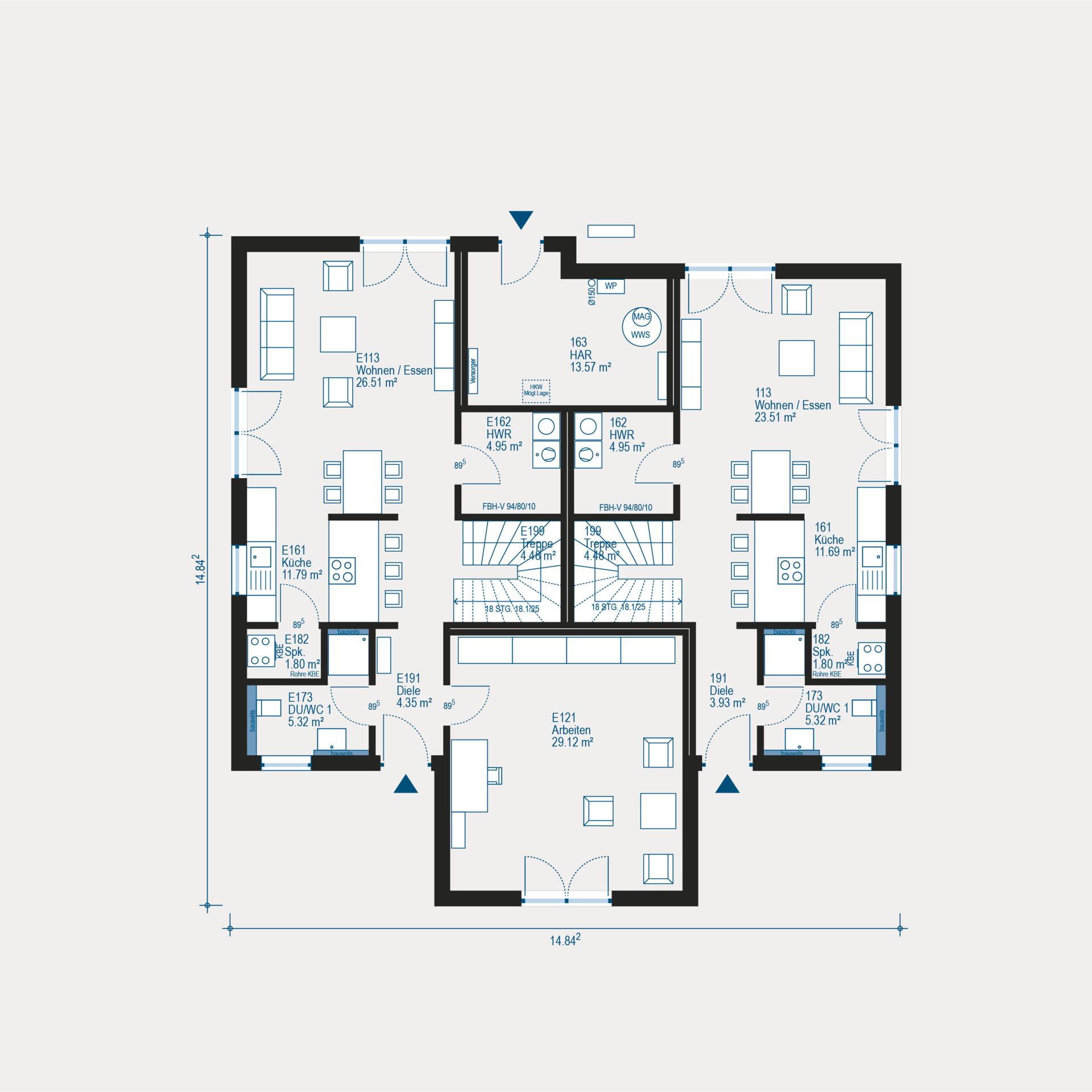 Modernes Doppelhaus-Konzept für Familie oder Freunde, mit offenen Wohnräumen, Privatsphäre im Obergeschoss & vielseitig nutzbarem Gemeinschaftsraum, z.B. für Co-Working.