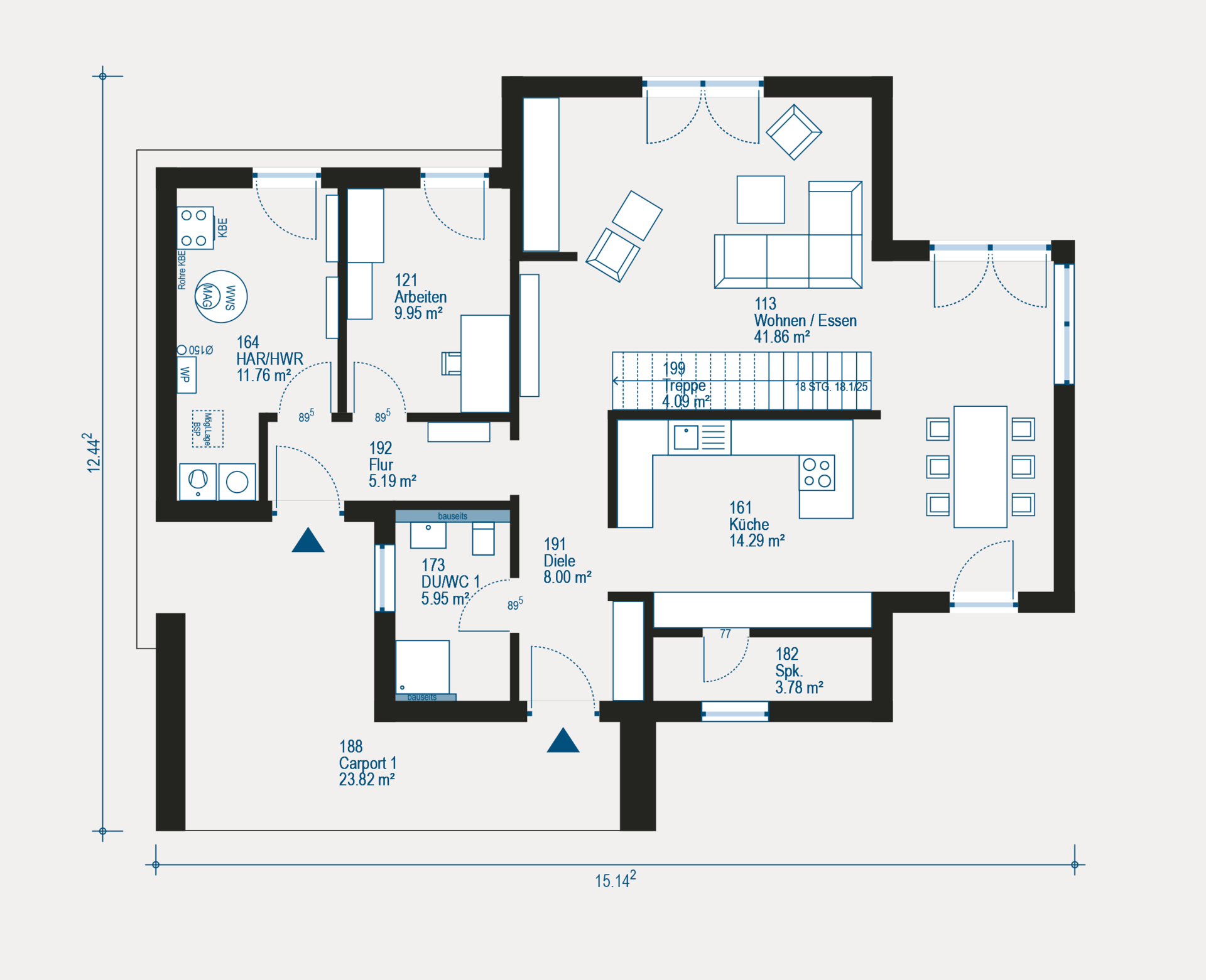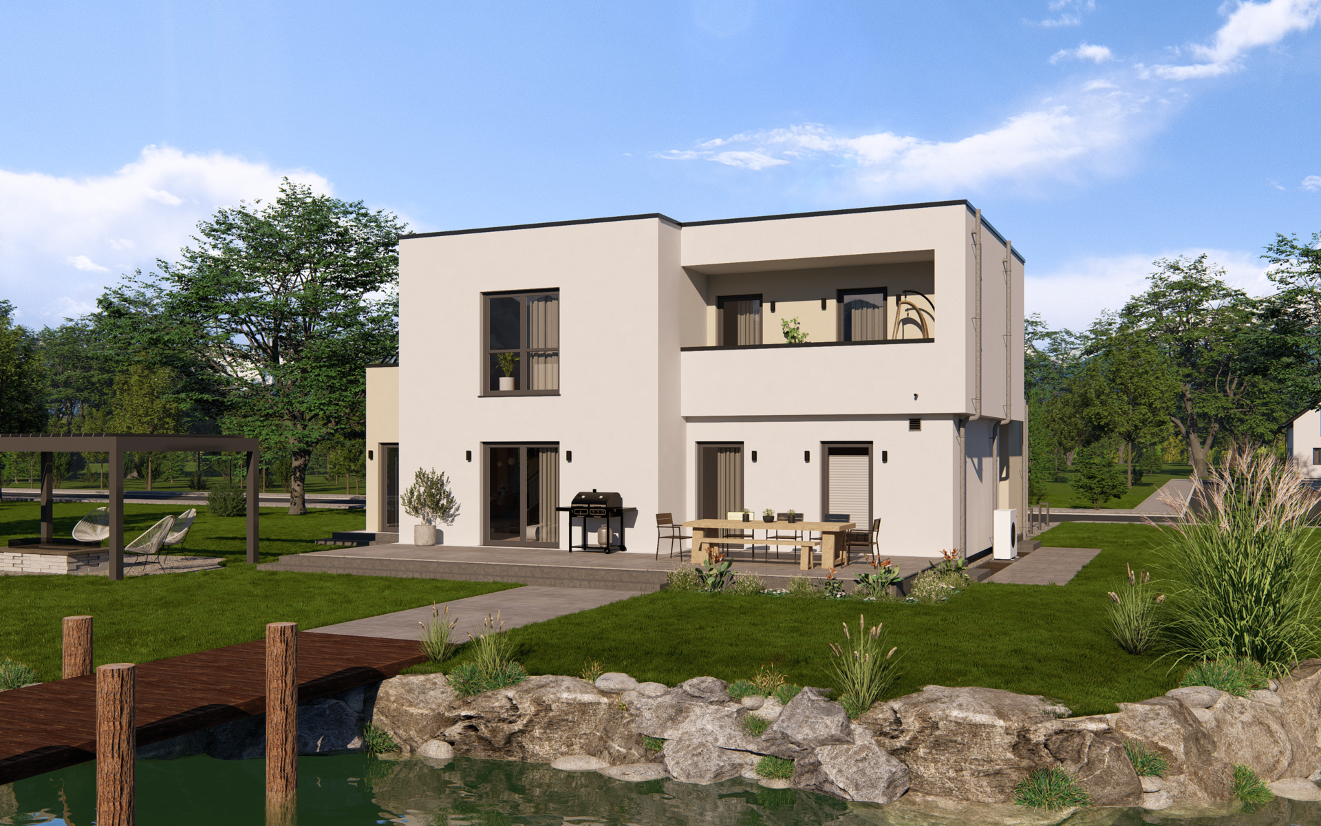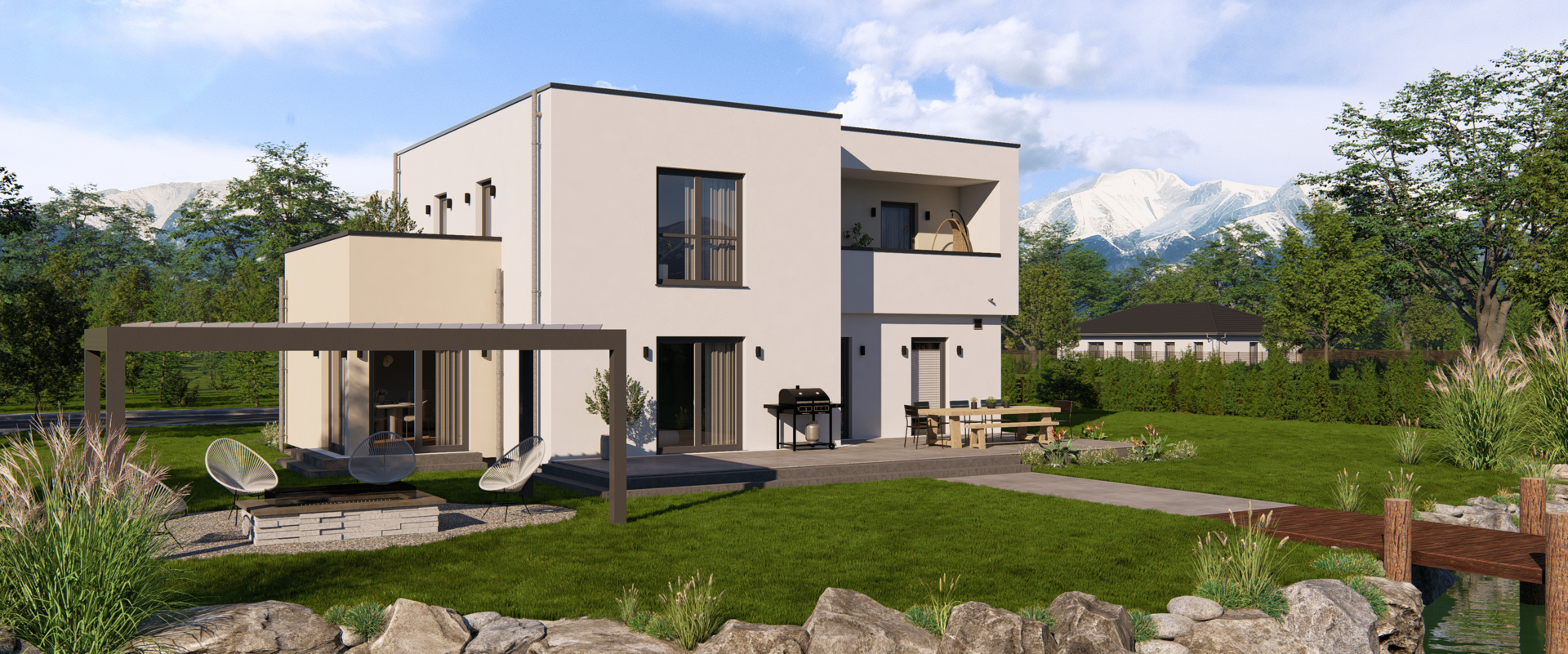 Das Highline 9 im Bauhaus-Stil kombiniert markante Architektur mit einer intelligent geplanten Raumaufteilung. Im Erdgeschoss erwartet dich ein weitläufiger Wohn-, Ess- und Kochbereich, ergänzt durch eine abgetrennte Speisekammer, ein Arbeitszimmer und ein Gäste-Bad – ideal für vielfältige Lebenssituationen.