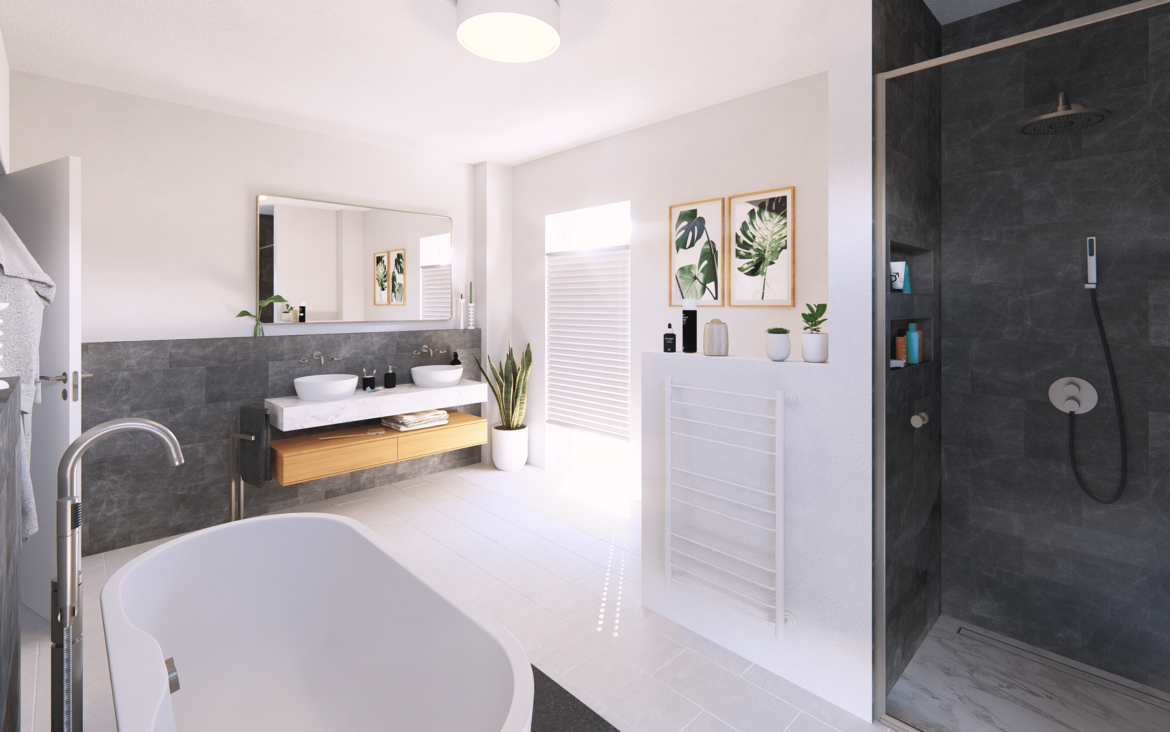 Im Obergeschoss wird es besonders großzügig: neben einer großzügigen Galerie findest du hier zwei Kinderzimmer. Außerdem befindet sich auf dieser Etage das Elternschlafzimmer mit eigener Ankleide und das große Wellnessbad. Insgesamt stehen dir zwei Balkone zur Verfügung – perfekt für entspannte Momente an der frischen Luft.