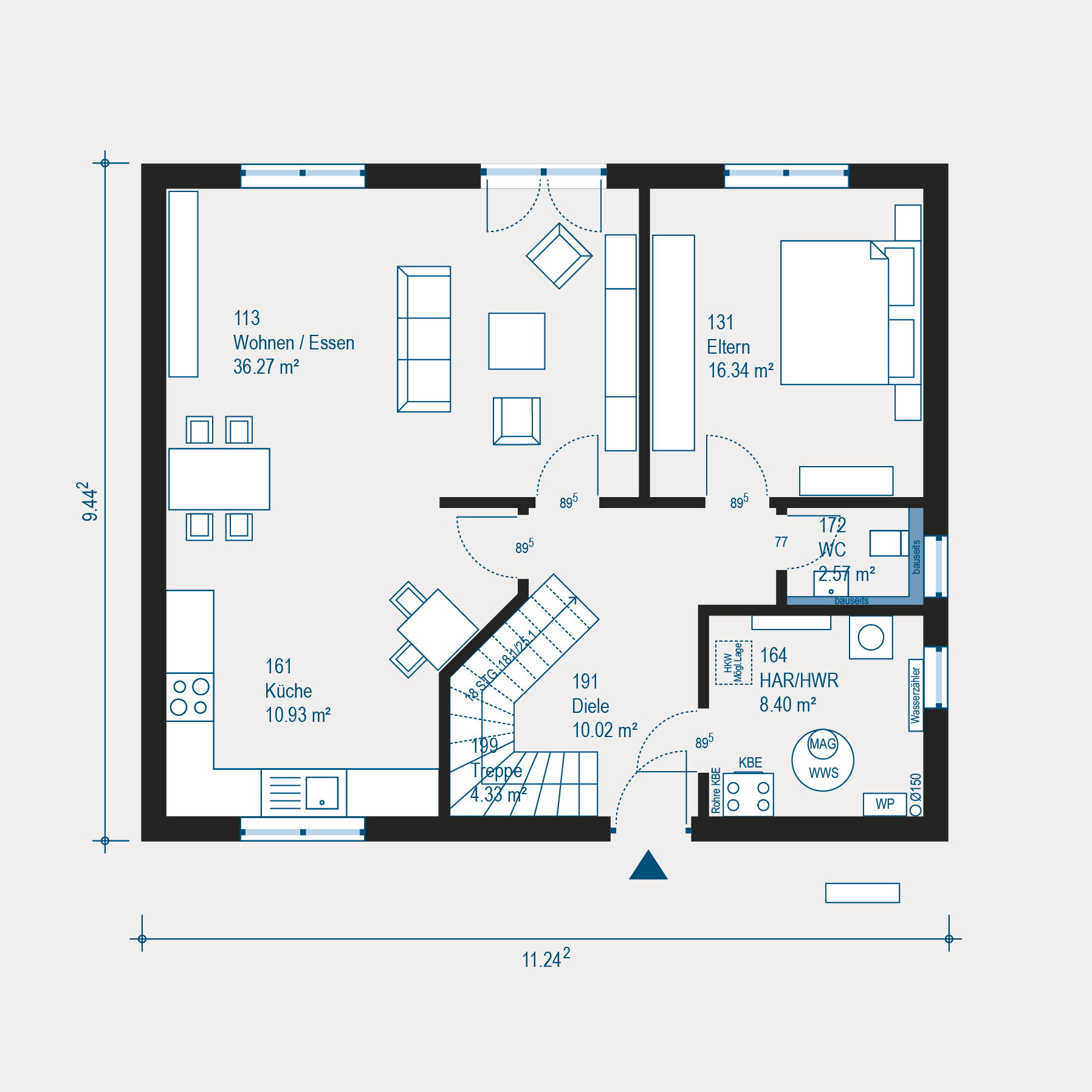 Unser Home 12 garantiert dir einzigartige Wohlfühlmomente auf einer Wohnfläche von über 170 m², verteilt auf 6 Zimmer. Die angegebenen Maße beziehen sich auf die Variante mit 1,5-geschossigem Satteldach.