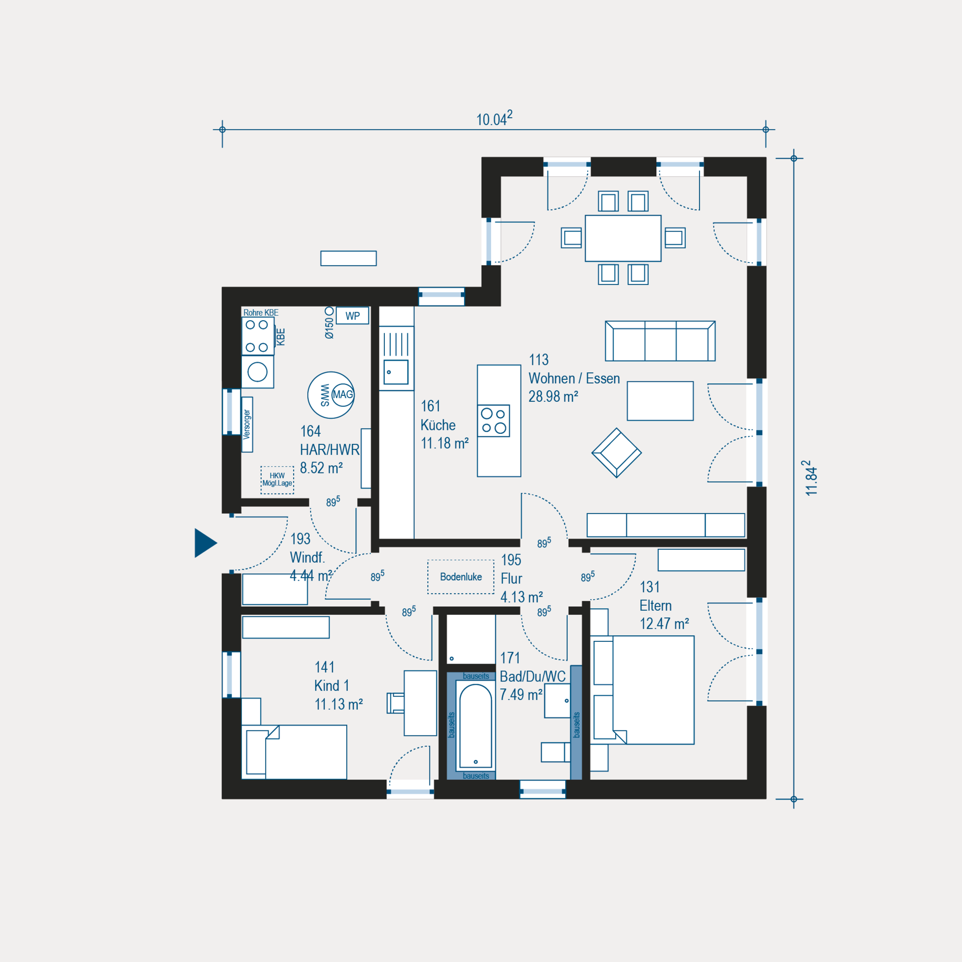 Dass ein Winkelhaus immer ein bisschen schöner und faszinierender wirkt, liegt wohl an der großzügig geschnittenen Sonnenterrasse, welche durch den intelligenten Winkelbau nicht nur vor Wind und Wetter geschützt ist, sondern gleichzeitig auch den Blick in die Landschaft öffnet. Wohn- und Essbereich bilden den Mittelpunkt des durch große Fenster und kleine Details bestechenden Familienhauses. Der Zugang zur Terrasse lädt zum Entspannen im Garten ein, sodass dieser Grundriss keine Wünsche offen lässt.