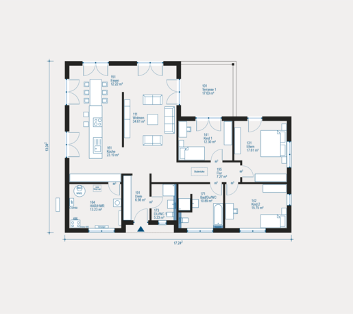 An Platz mangelt es im Bungalow Lifetime 7 ganz sicher nicht! Denn auf 176,91 m2 lässt es sich im Eigenheim mit dem Plus an Komfort wohnen. So begeistert beim diesem Bungalow vor allem der moderne, offene Wohn-Ess-Bereich und die großzügige Küche, die dank zwei Fensterflächen mit jeder Menge Tageslicht versorgt wird.
